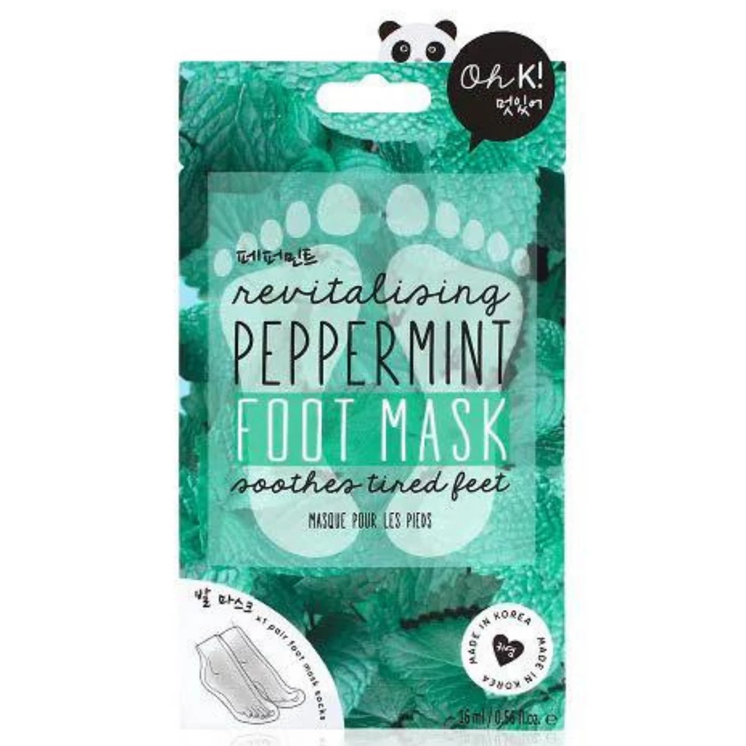 Tired, achy feet? Put some pep in your step with the non-peeling Oh K Peppermint Foot Mask The split sachet includes the revitalising formula as well as socks which hold the formula & help to maximize the masks hydrating effects.Key ingredients Peppermint (Mentha Piperita) – cools and soothes Shea Butter – Intense moisture for dry skin.