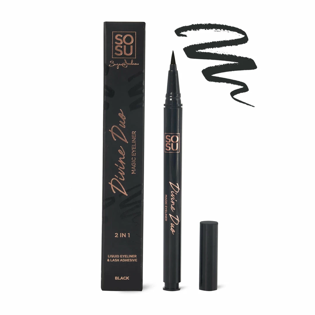 Lash Glue & Eye Liner Pen in ONE – say hello to our Divine Duo Magic Eyeliner. This innovative 2-in-1 jet black liquid eyeliner doubles as a powerful eyelash adhesive for quick & easy lash application β with no mess and no fuss!